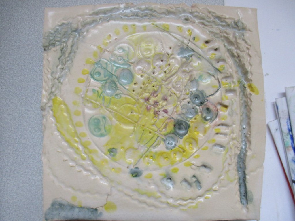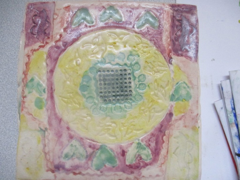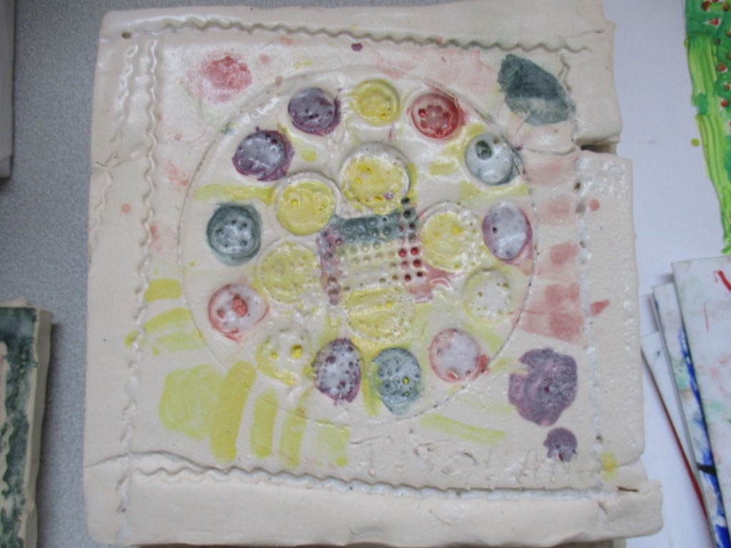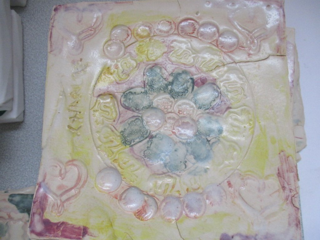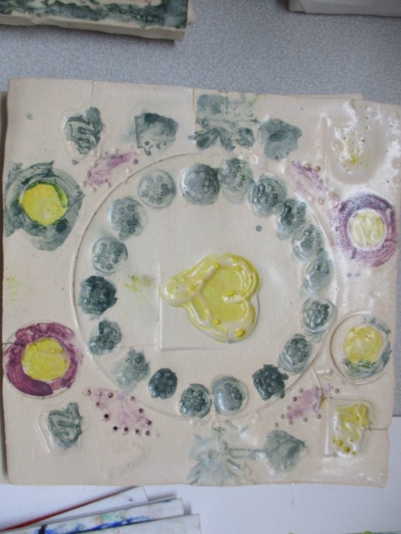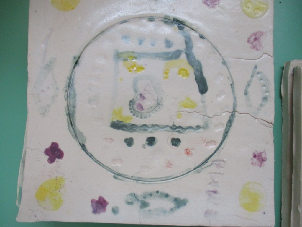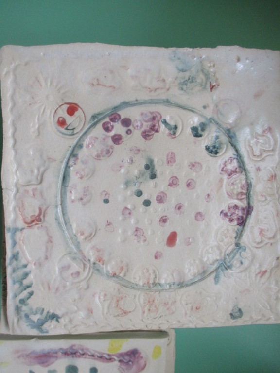 • 9éme journée: mise en couleur des carreaux puis émaillage et cuisson à 950°C dans le four de l’atelier.